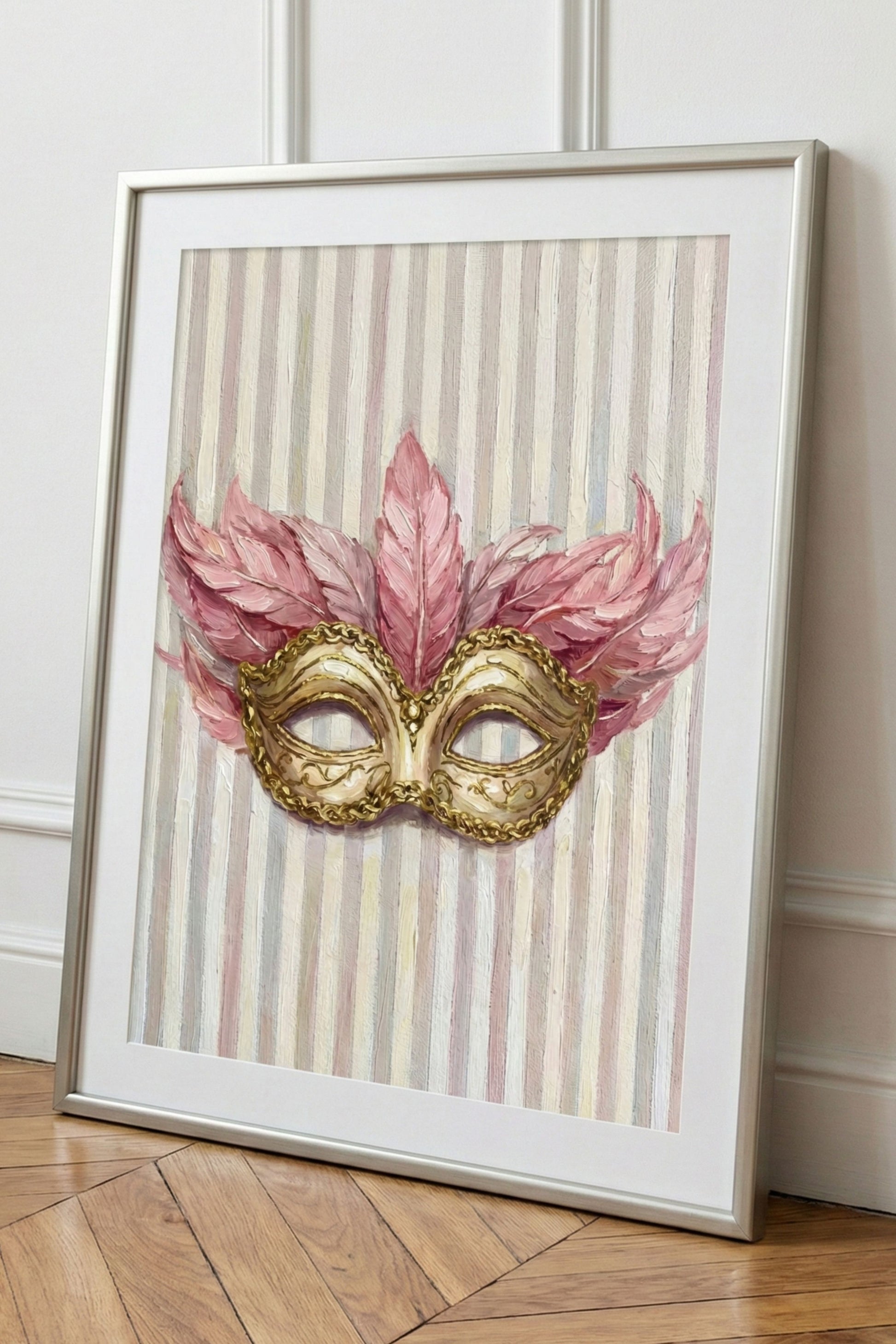 Inspirée par la splendeur intemporelle des bals masqués vénitiens, l'affiche "Le Masque de Plume" est une véritable célébration du secret et de l'élégance. Cette illustration exclusive met en scène un masque d'apparat finement ciselé d'arabesques dorées, couronné de plumes dans des dégradés de rose poudré et de vieux rose. Le fond rayé subtil, rappelant les tissus de haute couture, apporte une structure moderne à cette pièce d'influence baroque.